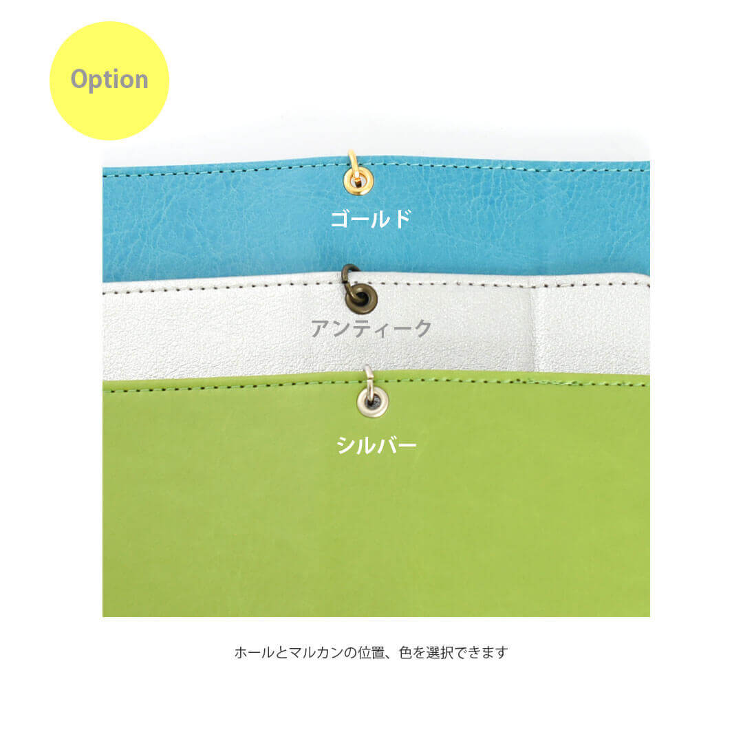 スマホカバーにストラップや飾りチャームをつけたい場合はオプションでハトメ(1個¥100)やマルカン(1個¥30)をつけることができます。