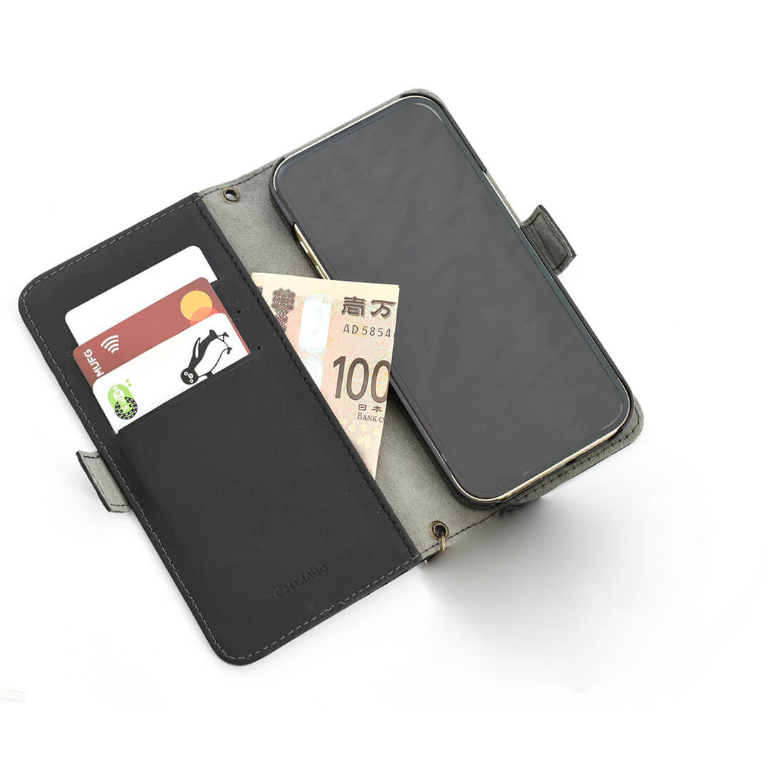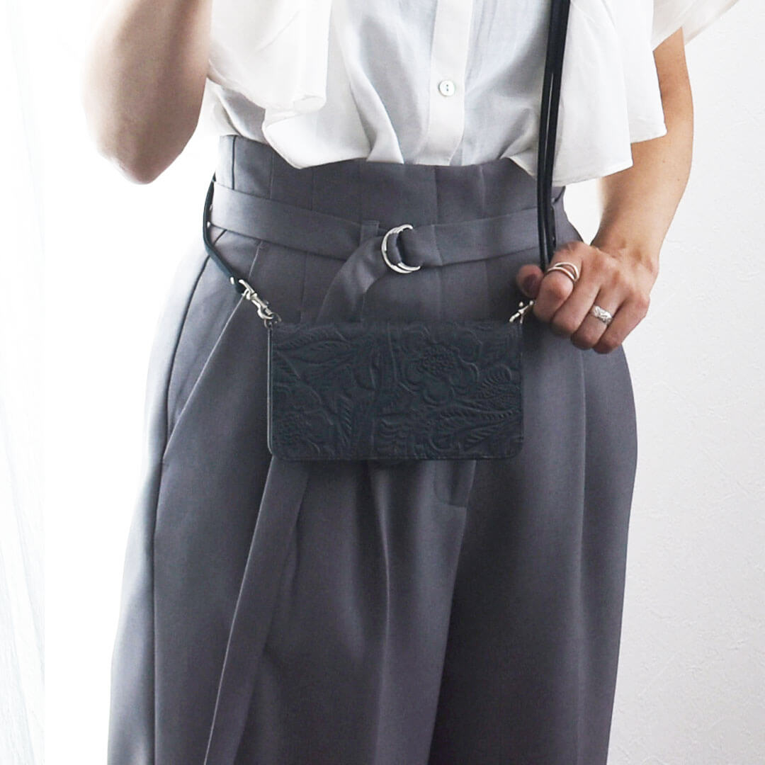 型押しデザインのスマホカバーを斜め掛けしてスタイルアップ