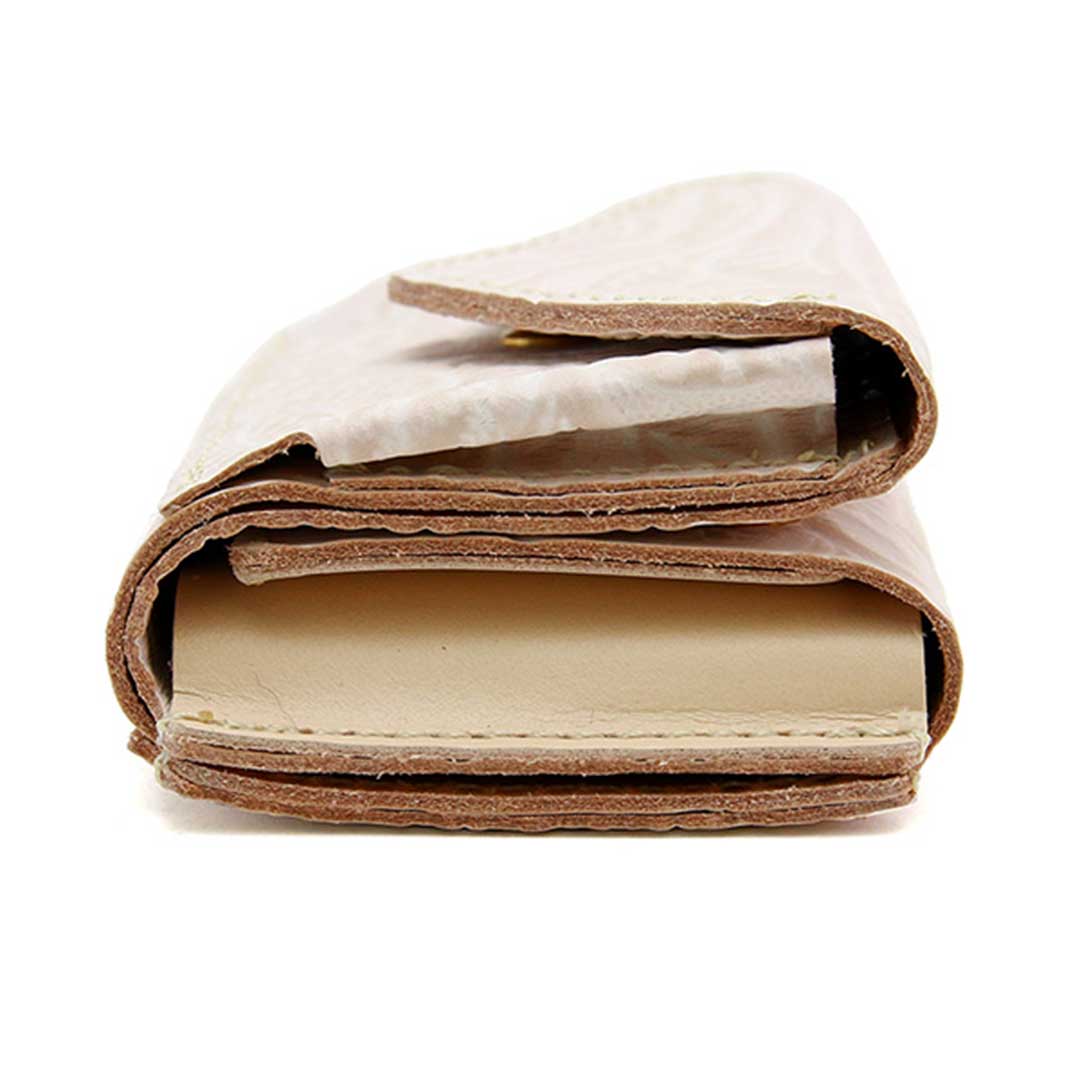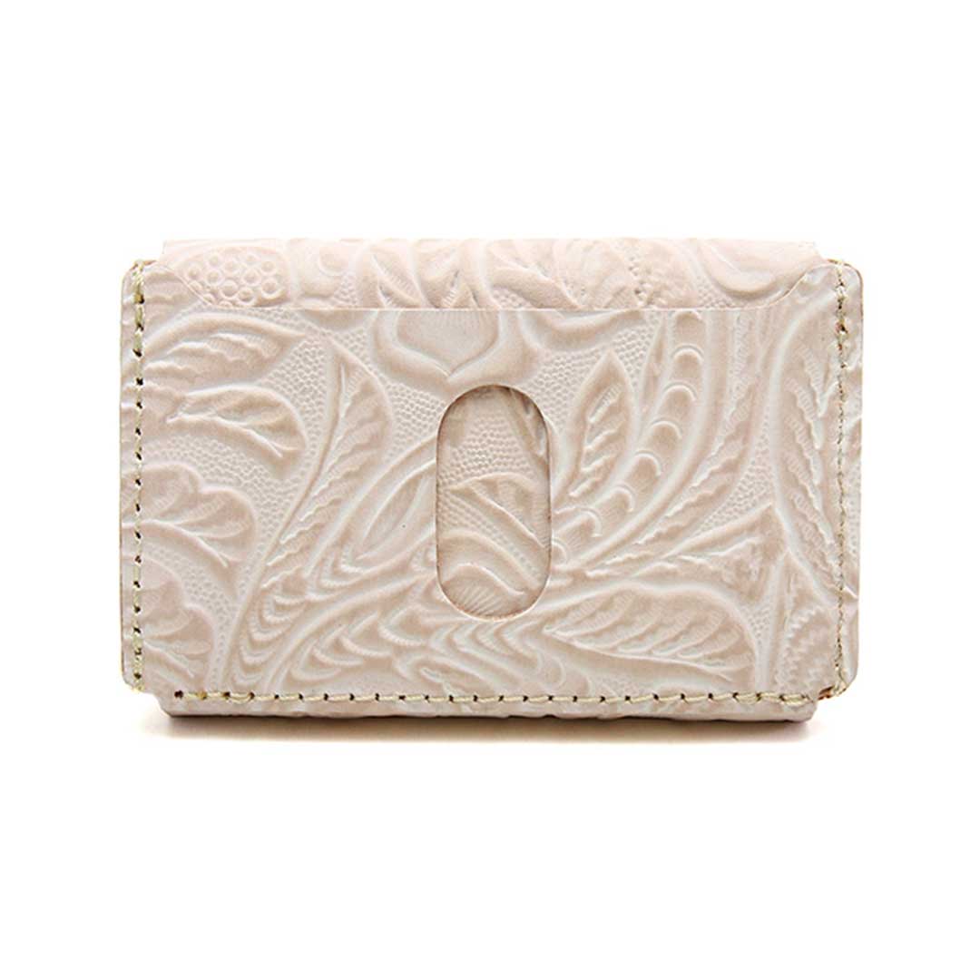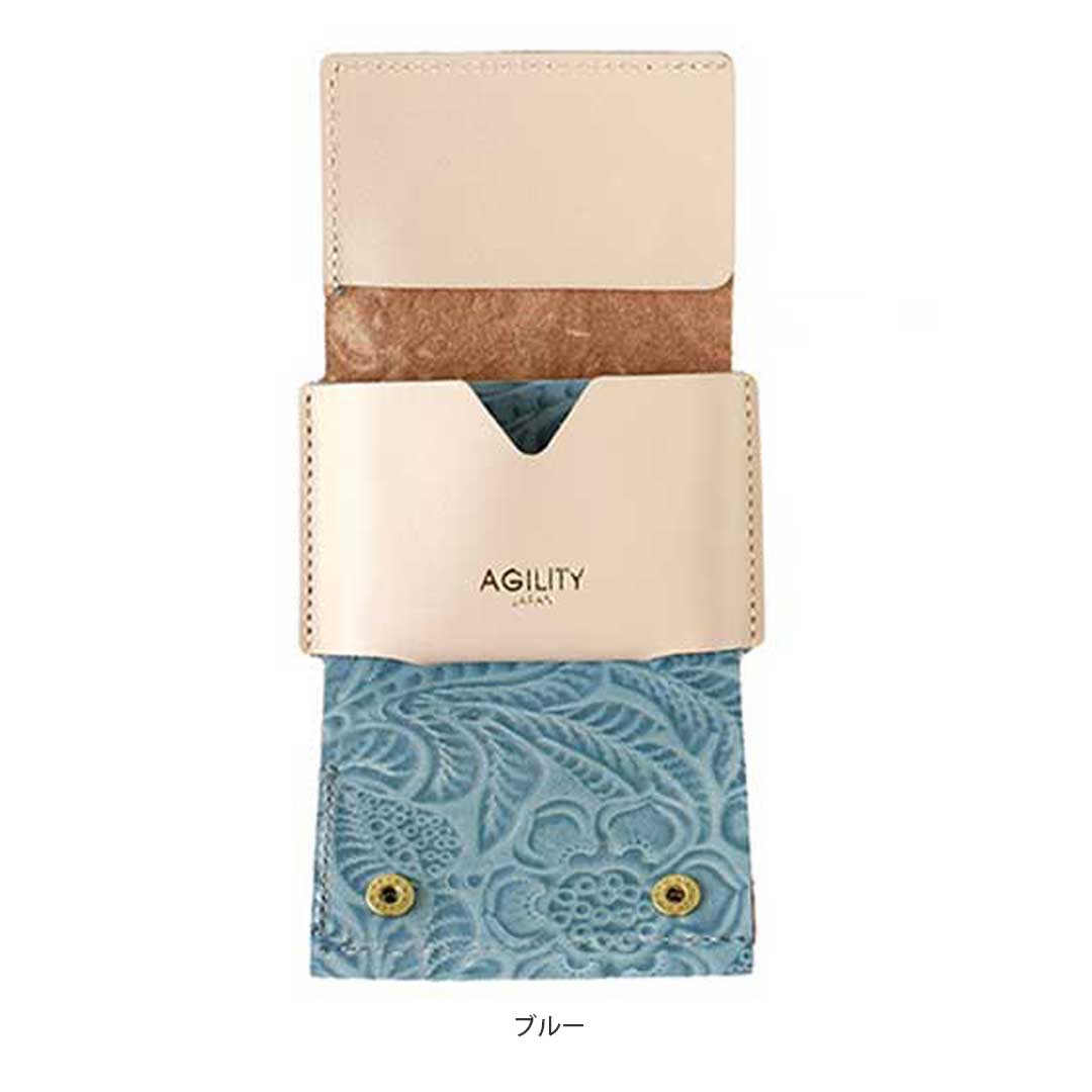 タンニンでじっくりと鞣した牛キップに、墨田区の染革加工場で下色をつけてからフラワーの型を型押し(エンボス)した革です。その上に熟練した職人が染料を手吹きで染め上げ、さらに頭ハリという工程で白いパラフィンをのせ、型押しに立体感をだしています。使っていくと艶があがり、より一層深い色に変化していくエイジングを愉しめます。機械ではなく職人の手で染色、加工をしているので個体差が生まれそれが特徴となっている革です。
