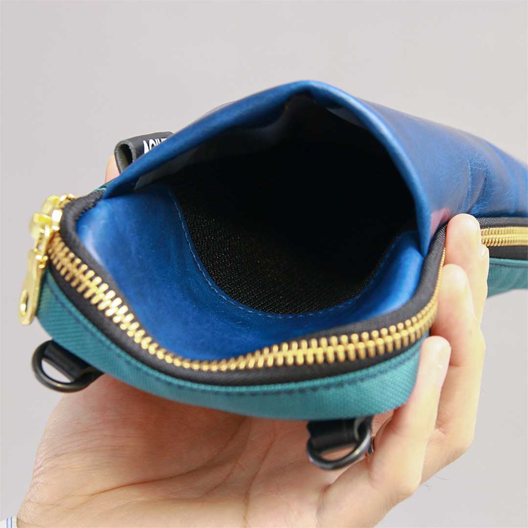 こちらの表ポケットの内側にはメッシュ素材を使用し、スマホを滑り落ちるのを防ぐ枠割をしています。