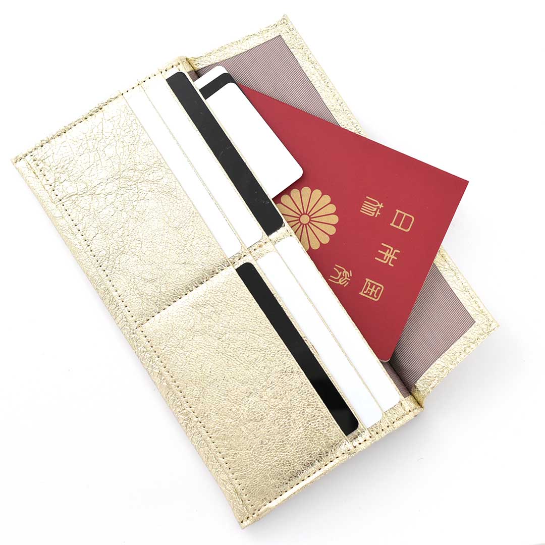 薄くてコンパクトに見えるこのお財布ですが、実はフラップ付きポケットには通帳やパスモートもすっぽり収納できますよ!