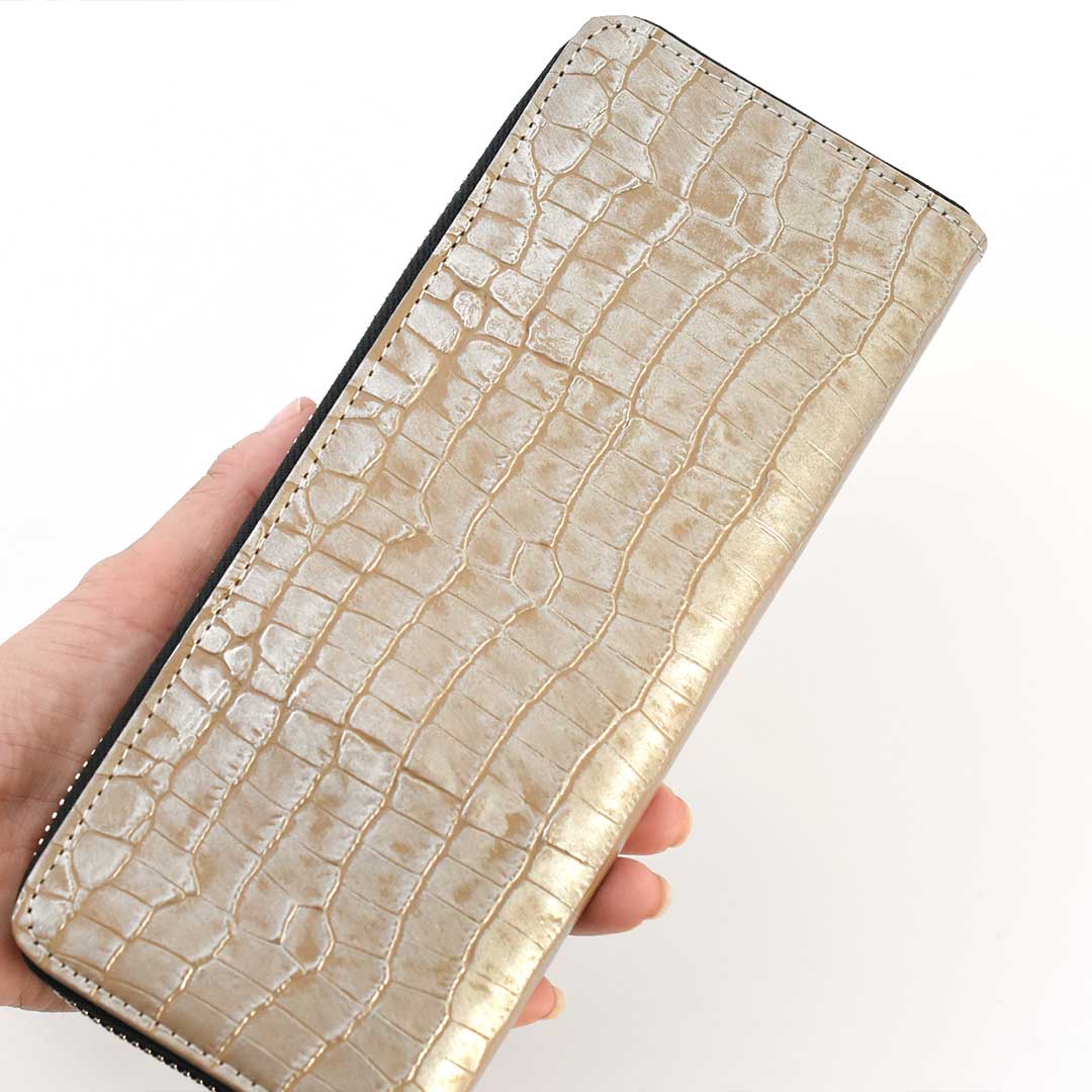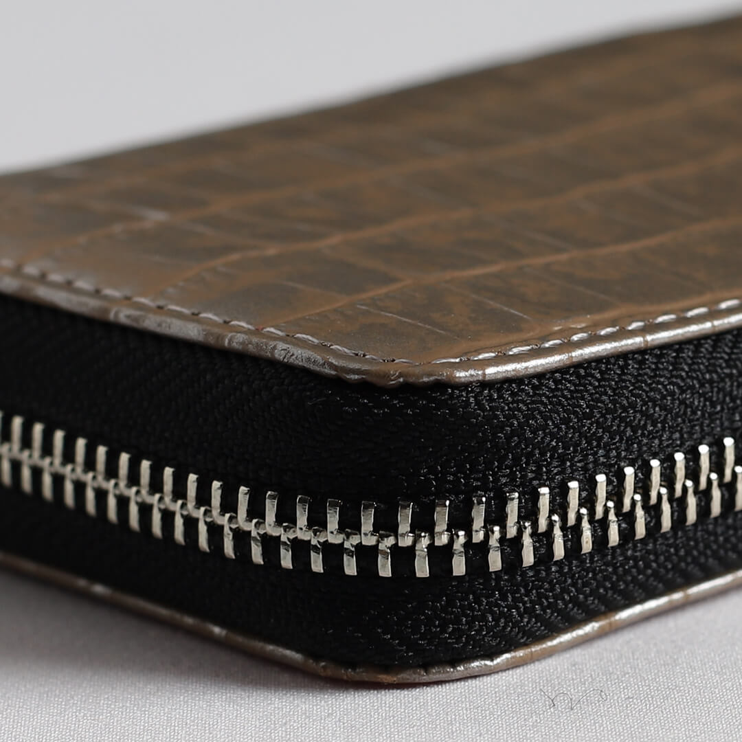 革は、北海道で肥育された牛皮を使い、姫路で卓越したクラフトマンたちが製造した、クロコの型押しの革。シルバー箔加工を施すことで革にさらにニュアンスが生まれます。