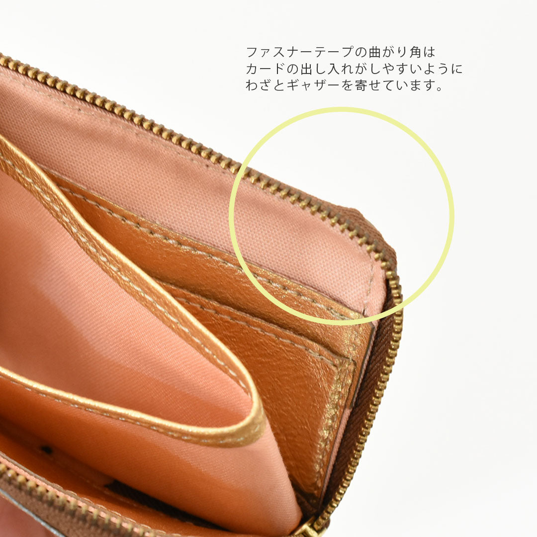 お札を半分に折って入れるタイプのコンパクトなお財布。小銭部分にもマチ有。