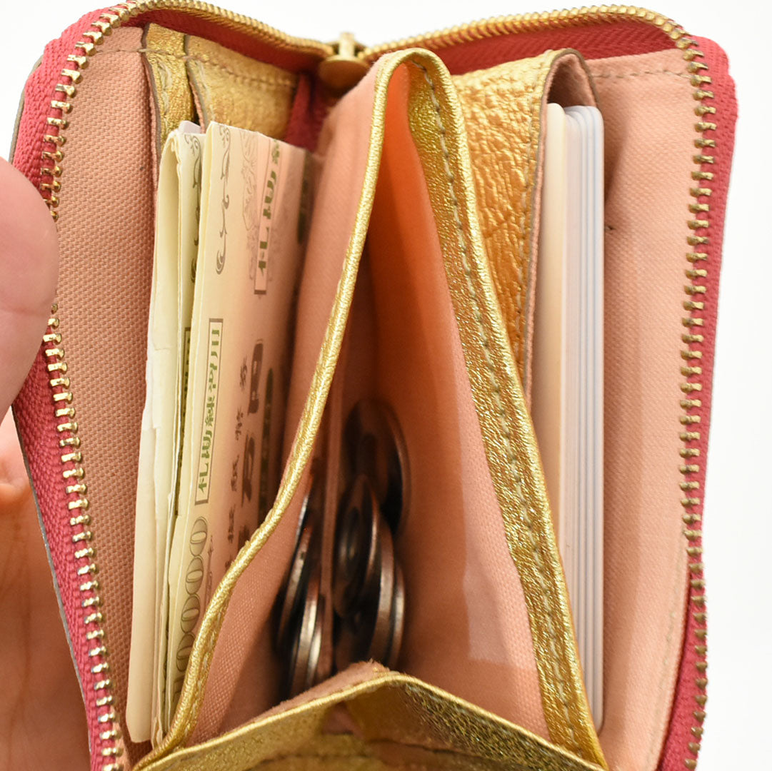 お札を半分に折って入れるタイプのコンパクトなお財布。小銭部分にもマチ有。