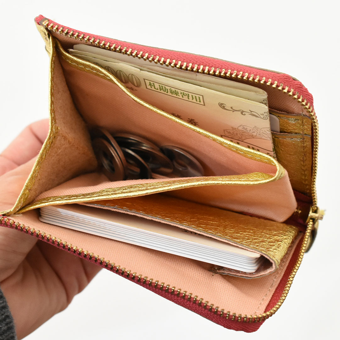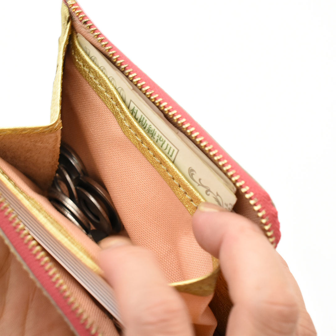 お札を半分に折って入れるタイプのコンパクトなお財布。小銭部分にもマチ有。